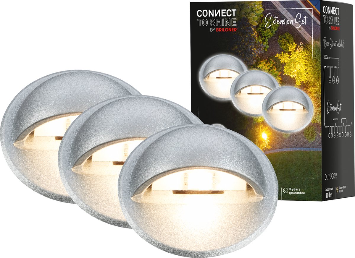 Illuminate your outdoor space with the BRILONER Connect to Shine LED Groundspot Set. This set of 3 warm white lights expands your garden lighting effortlessly. IP65 rated for durability. Ø3.5x3.6 cm.