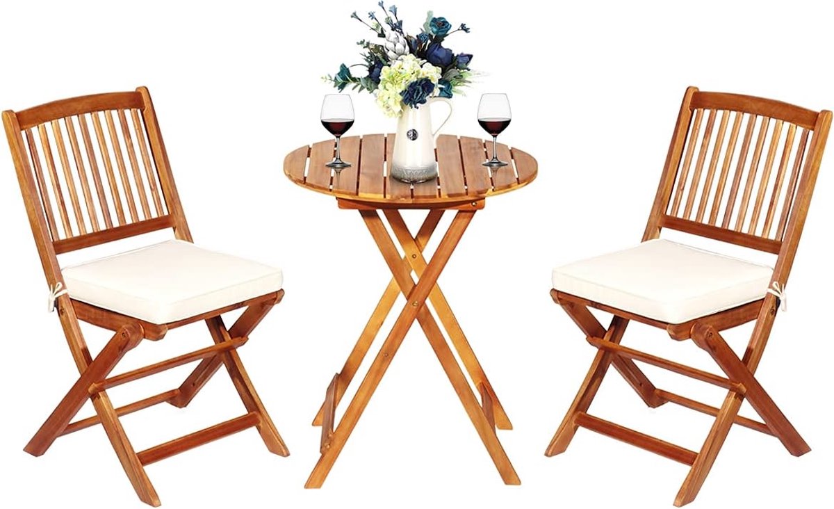 3-delige inklapbare balkonset, zitinrichting van acaciahout en met kussens, tuinmeubelset terrasset met ronde tafel en 2 stoelen, tuinzitgroep voor binnen en buiten