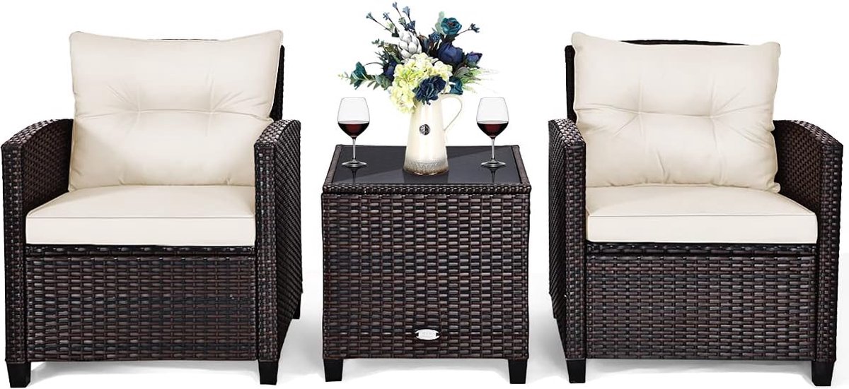 3-delige rotan balkonset, tuinmeubelset incl. 2 stoelen met 6 cm dik zit- en rugkussen en 1 tafel met 5 mm dik hardglas, tuinzitgroep voor balkon buiten, lichtbruin/crèmewit