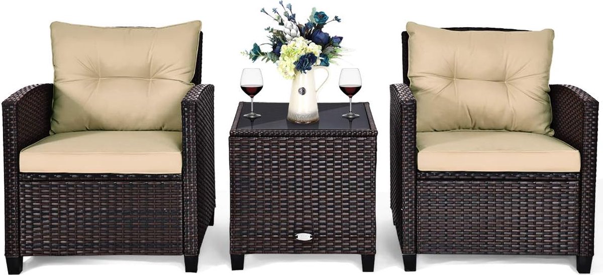 3-delige rotan tuinmeubelset, polyrotan zitset, 2 fauteuils en 1 bijzettafel, balkonmeubels, bistroset, tuinset, tuinlounge tuinset inclusief glazen blad en zitting