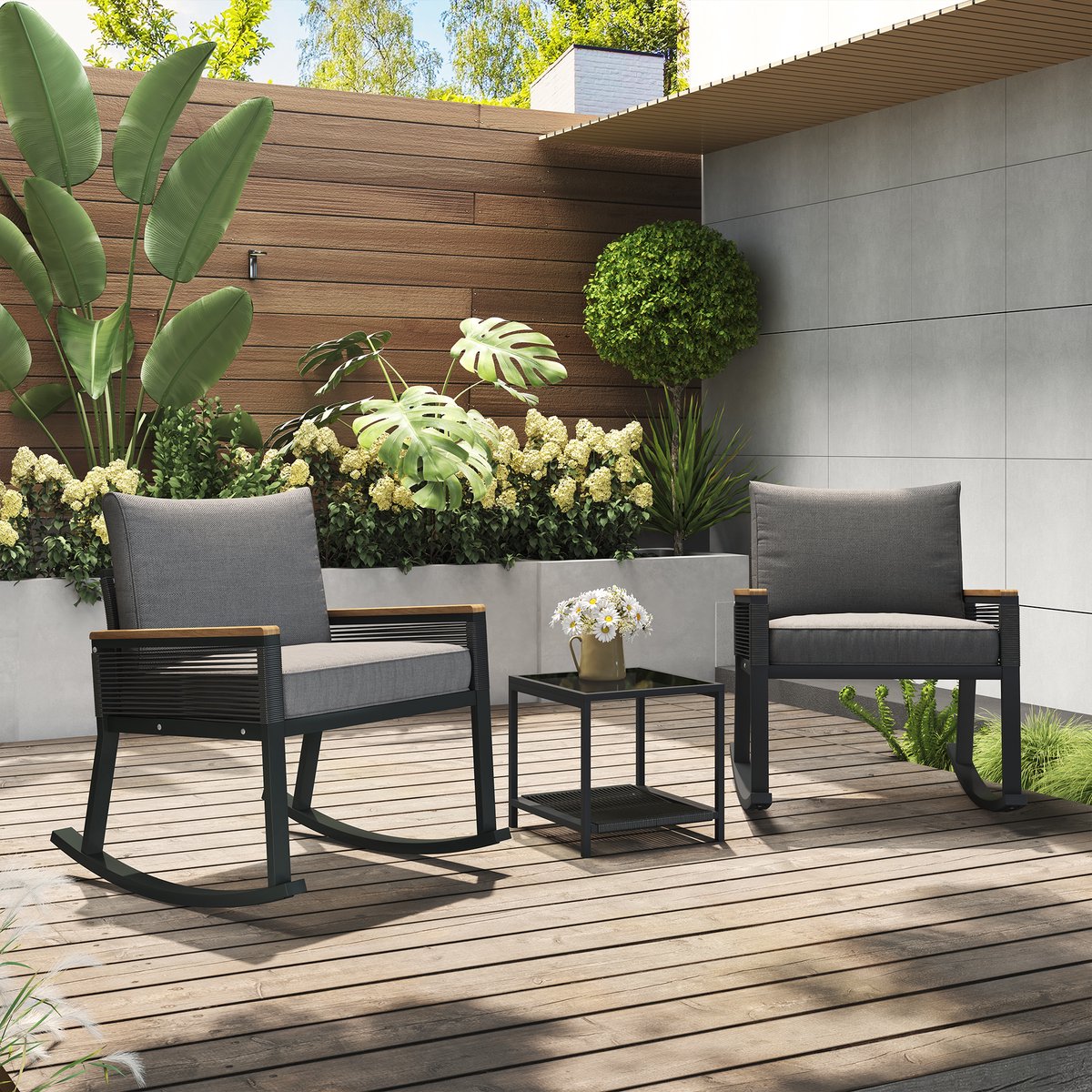 3-delige set – bistroset – schommelstoelset met touw – met glazen salontafel met zitkussen en rugleuning