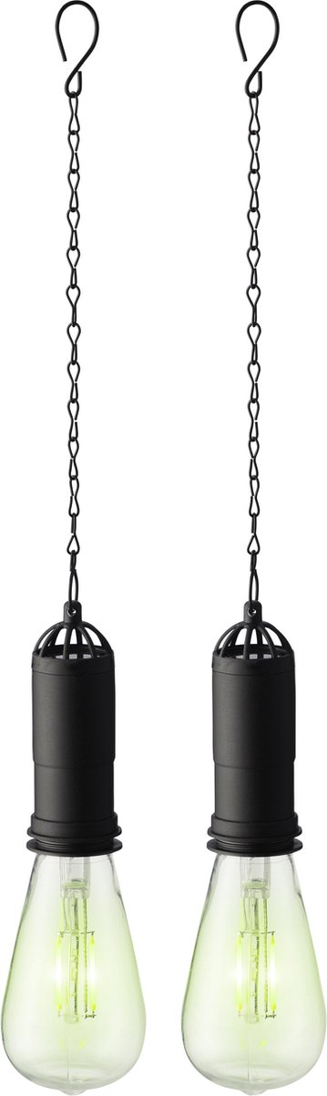 Elevate your garden ambiance with this set of 2 green solar hanging lamps made of durable plastic. Measuring 20 cm each, these solar lights from Lumineo add a charming glow to your outdoor space.