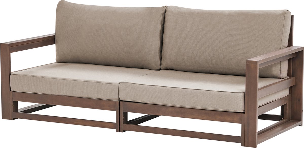 Houten tuinbank met kussens. Deze tuinbank is voorzien van modulaire elementen die aan elkaar kunnen worden gezet of als aparte zitplaatsen kunnen worden gebruikt. Het is gemaakt van acaciahout in een mooie, donkere houttint en is perfect voor loungeruimtes buiten, en het is gemakkelijk schoon te maken. Met de dik gevoerde zit- en rugkussens, in een taupe tint, gecombineerd met een comfortabel, laag design frame, is dit de perfecte blikvanger voor elke moderne tuin of terras. Details: Producttype: Tuinbank Stijl: Modern Kleur: Donkere houtkleur Kap: Taupe Soort materiaal: Massief hout Hoofdmateriaal: FSC® gecertificeerd acaciahout Overig materiaal: Polyester Material Composition: 100% polyester Dichtheid schuim zitting: 20 kg/m3 Afmetingen: Hoogte armleuningen: 52 cm Diepte: 75 cm Dikte zitting: 12 cm Hoogte zitting: 32 cm Breedte: 184 cm Hoogte: 72 cm Zitoppervlak: 170×62 cm Gewicht: 34 kg Draagvermogen: 320 kg Aanbod omvat: 1 x Tweezitsbank, Kussens inbegrepen Belangrijkste eigenschappen: Kan gecombineerd worden met andere modulaire elementen uit de collectie, Uitstekende plek om te ontspannen, Modern terras- en tuinmeubilair, Hoogwaardig materiaal, UV-bestendigheidsklasse 3 (ISO 105-B02), Verwijderbare kussenhoezen Montageinformatie: Volledige montage vereist. meer dan 60 minuten. Extra informatie: Voor dit product bieden we een gedetailleerd onderhoudsboek aan om ervoor te zorgen dat het meubilair er zo lang mogelijk goed uit blijft zien. Bekijk de onderhoudsinstructies en tips om goed voor je nieuwe product te kunnen zorgen – je vindt deze bij de montagehandleiding van het product op onze website. Tekst weerstand: UV-bestendige meubels hebben een verhoogde weerstand tegen vervaging of verkleuring. We raden echter aan om het product overdekt of onder een beschermhoes te bewaren wanneer het niet in gebruik is. Dit zorgt ervoor dat je langer kunt genieten van je tuinmeubels. Weerstand: Spat- / vochtbestendig Onderhoudstips: Acaciahout: 1.Maak schoon met een mild schoonmaakmiddel en een zachte doek met de houtnerf mee. Droog meteen na reiniging 2.Maak buiten het seizoen en bij regen gebruik van een beschermhoes of plaats wanneer mogelijk de meubels op een koele, droge plek 3.Geoliede meubels zullen voor gebruik en na het seizoen vóór het opbergen opnieuw in de olie gezet moeten worden, vooral in een vochtig klimaat. Polyester: 1.Was met de hand, gebruik koud water en een milde zeep 2.Wanneer niet in gebruik, bewaar het product op een schone, droge plek om het te beschermen tegen weersomstandigheden 3.Niet geschikt voor de droger of om te strijken.
