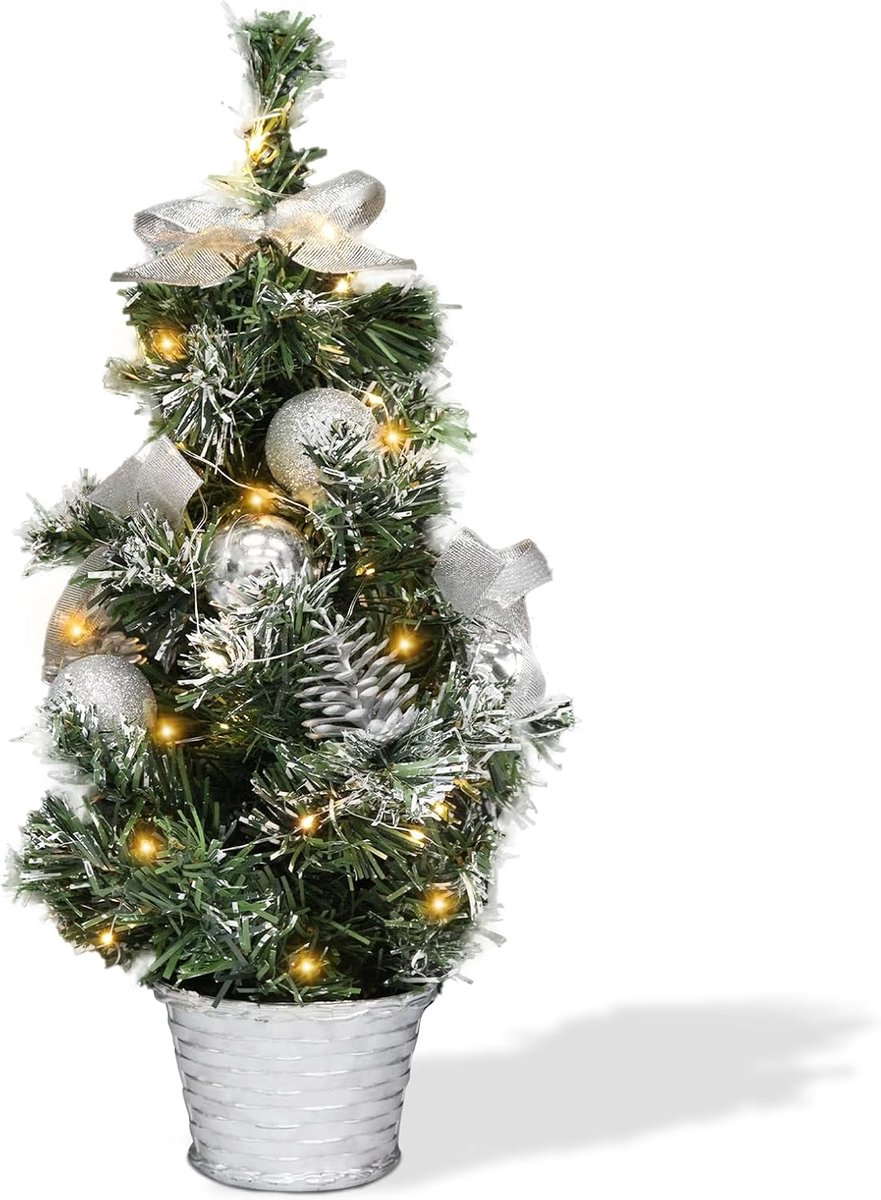 Kleine kerstboom – mini-kerstboom – kunstkerstboom 40 cm – met 20 ledlampen – dennenappels en kerstballen – voor thuis en kantoor – tafeldecoratie (zilver)