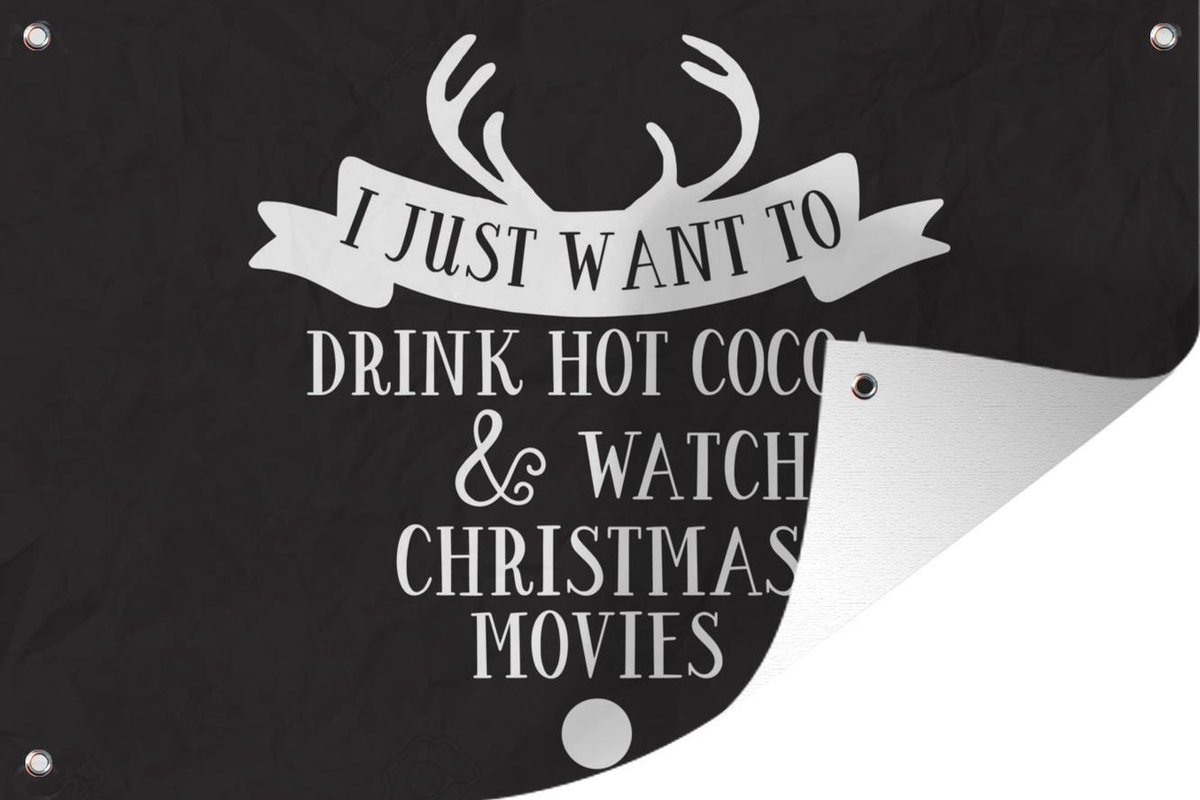Muurdecoratie Kerst quote “I just want to drink hot cocoa” op een zwarte achtergrond – 180×120 cm – Tuinposter – Tuindoek – Buitenposter
