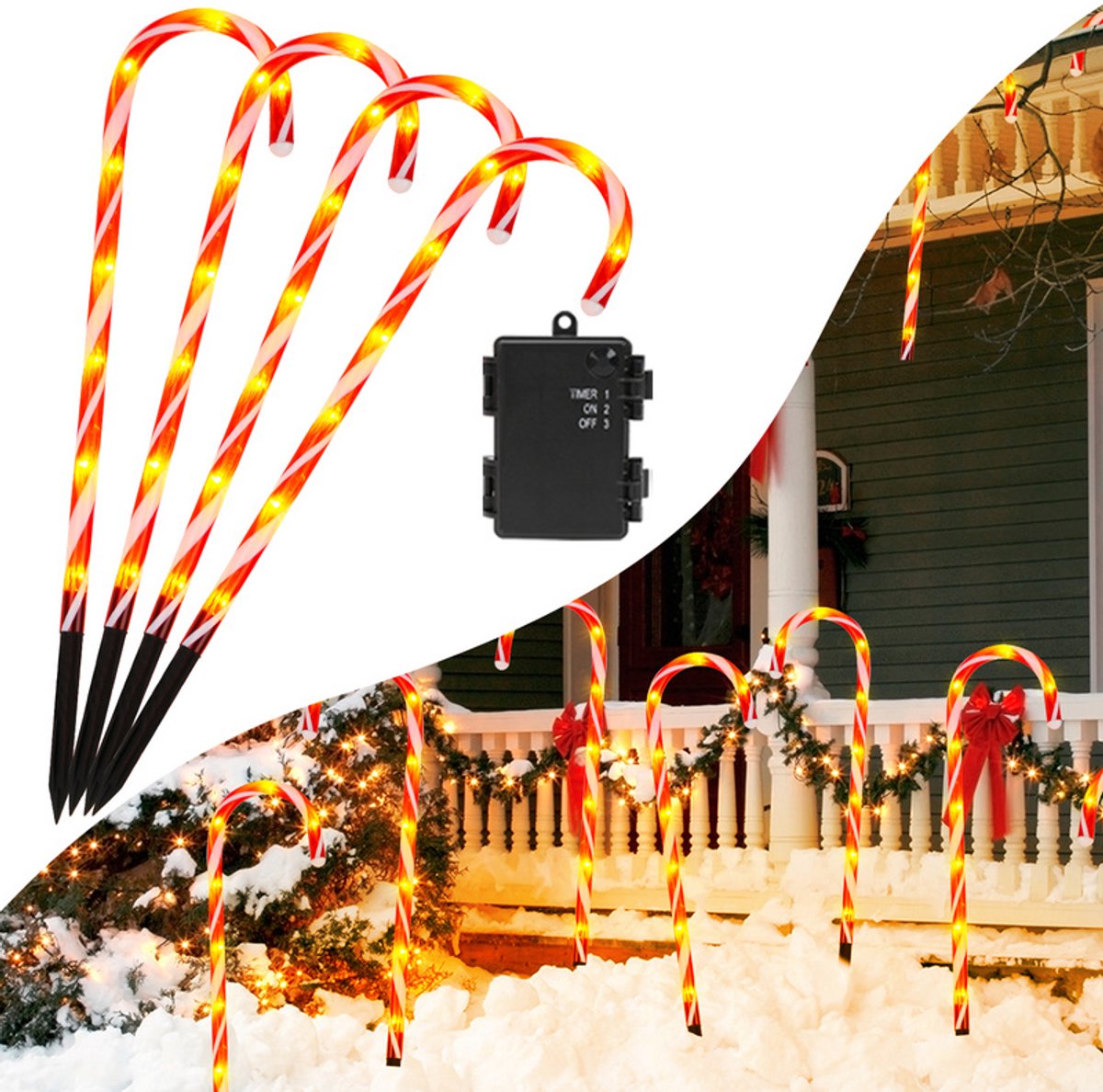 Set van 4 LED-suikerstokjes kerstdecoratie lichtslinger met timerfunctie kerstverlichting lichtstaaf batterijgevoed tijdschakelaar tuinlichtstaven buitenverlichting