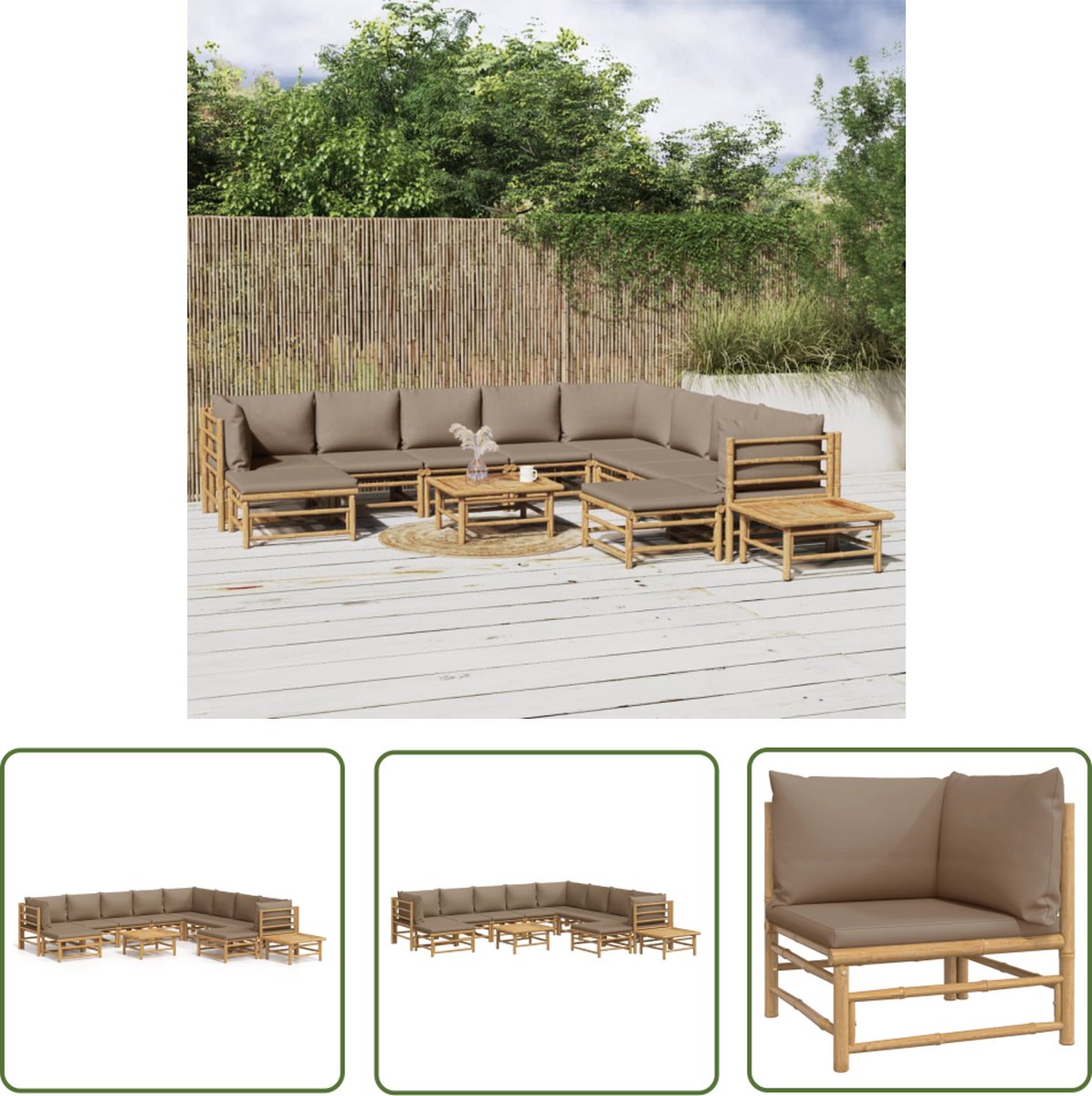 The Living Store 12-delige Loungeset met kussens bamboe taupe – Bamboelounge – Lounge Set – Tuinlounge – Buitensalon – Loungestoel