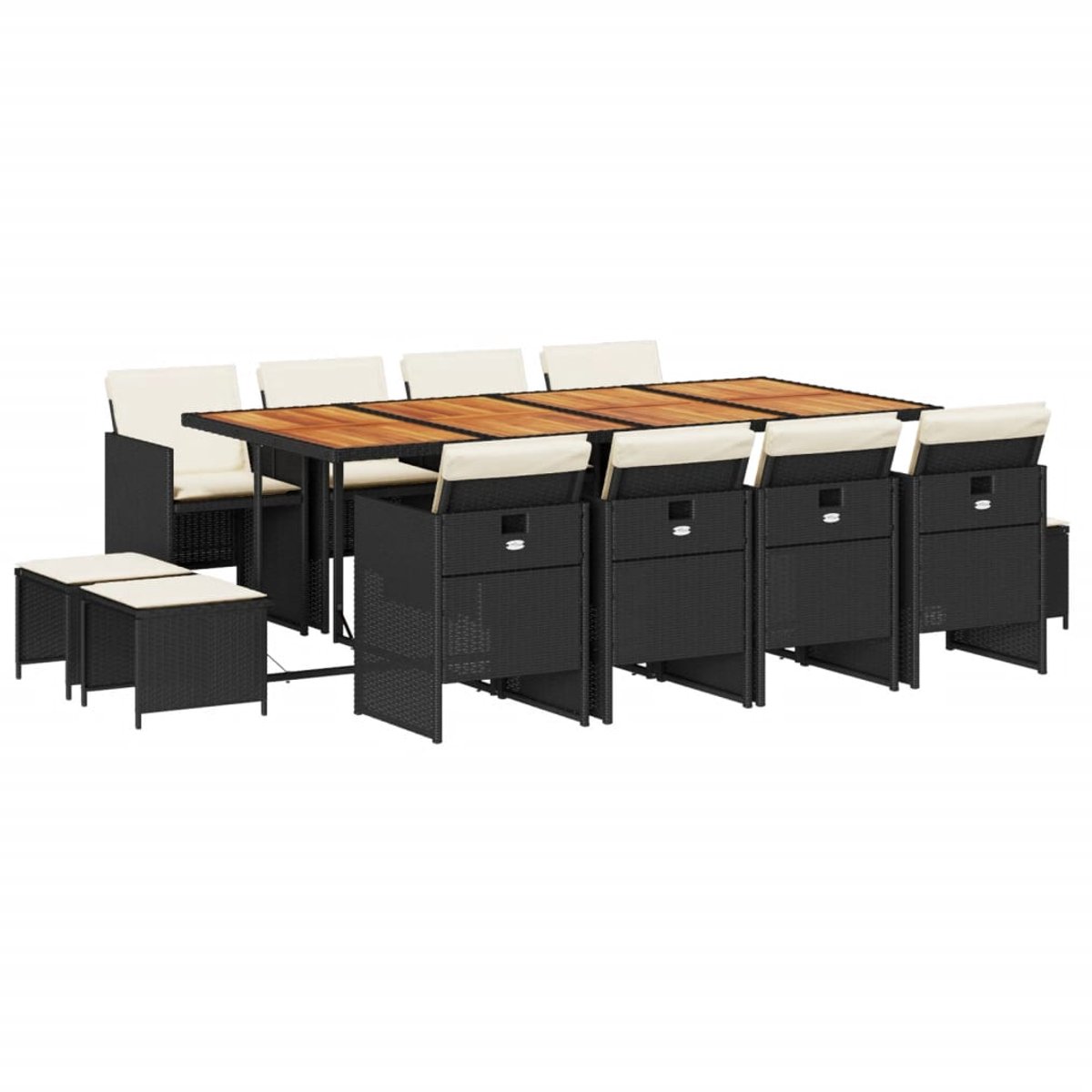 13-delige Tuinset met kussens poly rattan zwart Deze tuinset is een goede keuze als je ervan houdt om gezellig buiten te eten of gewoon in de tuin, of op het terras wil ontspannen. Duurzaam materiaal: PE-rattan, ook wel poly rattan genoemd, is een sterke, onderhoudsarme kunststof die lijkt op natuurlijk rattan. Het is licht van gewicht en gemakkelijk schoon te maken en wordt vaak gebruikt voor tuinmeubelen vanwege de duurzaamheid en weerbestendige eigenschappen. Compact opbergen: deze stoelen hebben een inklapbare rugleuning, waardoor je ze gemakkelijk onder de tafel kunt opbergen. Wanneer ze zijn ingeklapt, passen ze netjes onder de tafel en vormen ze een ruimtebesparende kubusvorm. Daarnaast kunnen de voetenbanken onder de stoelen worden opgeborgen, waardoor de ruimte-efficiëntie nog verder wordt gemaximaliseerd. Comfortabele zitervaring: deze buitenmeubelen, compleet met dik gevoerde kussens, bieden een comfortabele zitervaring. Afneembare en wasbare hoes: deze zitkussens hebben afneembare hoezen, waardoor ze eenvoudig te wassen en te onderhouden zijn. Stevig en eenvoudig schoon te maken tafelblad: deze tuintafel heeft een houten blad dat stevig, duurzaam en eenvoudig schoon te maken is met een vochtige doek. Goed om te weten: Om de levensduur van je tuinmeubelen te verlengen, raden wij je aan om de meubelen met een waterbestendige hoes af te dekken. Jouw voordelen Deze tuinset is een goede keuze als je ervan houdt om gezellig buiten te eten of gewoon in de tuin, of op het terras wil ontspannen. Overige specificaties Draagvermogen (per zitplek): 110 kg Uv-bestendig Montage vereist: ja Tafel: Kleur: zwart en bruin Materiaal: PE-rattan, gepoedercoat staal en massief acaciahout met olieafwerking Afmetingen: 220 x 106 x 73 cm (L x B x H) Stoel: Kleur: zwart Materiaal: PE-rattan en gepoedercoat staal Afmetingen: 50,5 x 54 x 79 cm (B x D x H) Afmetingen zitting: 45,5 x 38 cm (B x D) Zithoogte vanaf de grond: 43 cm Hoogte armleuning vanaf de grond: 63,5 cm Kruk: Kleur: zwart Materiaal: PE-rattan en gepoedercoat staal Afmetingen: 41 x 41 x 36 cm (B x D x H) Kussen: Kleur: crèmewit Materiaal hoes: stof (100% polyester) Materiaal vulling: schuim Afmetingen stoelkussen: 76 x 46 x 2 cm (L x B x D) Verpakkingsinhoud 1 x tuintafel 8 x tuinstoel 4 x tuinkruk 4 x voetenbankkussen met afneembare en wasbare hoes 8 x stoelkussen voor hoge rugleuning, met afneembare en wasbare hoes Goed om te weten Uw bestelling wordt in 5 pakketten geleverd. U krijgt direct uw bezorginformatie van ons wanner uw bestelling succesvol is ingepakt. In sommige gevallen kan het voorkomen dat uw bestelling niet in één keer bij u aankomt. In dat geval wordt veelal de overige pakketten één dag later geleverd. Dit kunt u vinden de mail omtrent uw bezorginformatie. Wij wensen u veel plezier met uw aankoop. Onze belofte Wij vinden het erg belangrijk dat u zorgeloos en zonder moeite online moet kunnen winkelen. Daarbij hoort een fijne service! Wij willen deze service graag aanbieden aan u als klant. Bij ons kunt u er altijd van op aan dat uw bestelling gratis bij u geleverd wordt. Geen verborgen of extra kosten dus! Bent u toch niet helemaal tevreden met uw bestelling dan zorgen wij ervoor dat u uw bestelling ook altijd kunt retourneren aan ons! Heeft u nog overige vragen over uw product of over uw bestelling, dan staan onze specialisten voor u klaar!