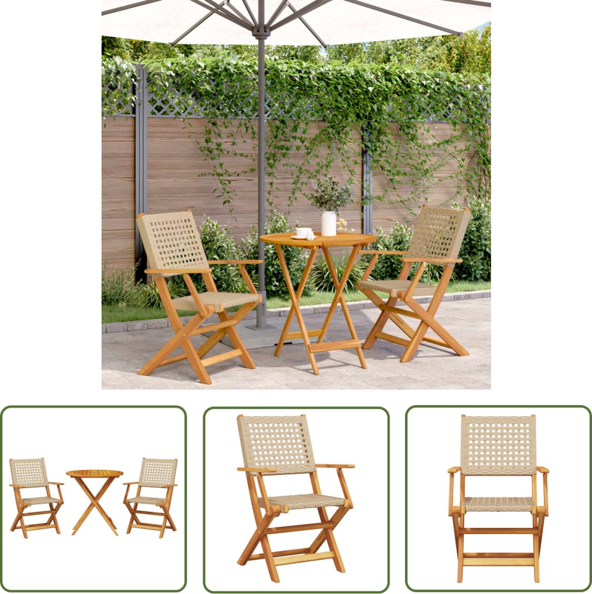 Transformeer je buitenruimte met dit elegante 3-delige Bistroset van poly rattan en massief acaciahout in een prachtige beige tint. Perfect voor buiten decoreren en genieten van de zon. Opvouwbare tafel voor extra gemak.