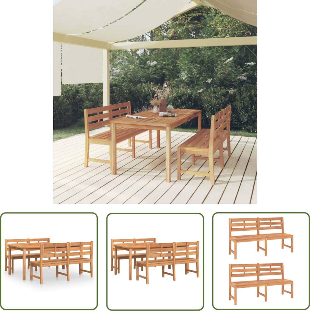 3-delige Tuinset massief teakhout Deze houten eethoek heeft een elegant en modern ontwerp. Hij is een perfecte keuze om in de tuin te dineren of relaxen. Massief teakhout: massief teakhout is een prachtig, natuurlijk materiaal. Het is gewaterd, in de oven gedroogd en vervolgens fijn geschuurd om het een zeer glad uiterlijk te geven. Teakhout is erg sterk en weerbestendig. Stevig tafelblad: de eettafel heeft een stevig tafelblad. Je kunt er snacks, drankjes en je favoriete items op neerzetten. Waterbestendig: dankzij de waterbestendige eigenschappen en klassieke uitstraling kun je de tuinmeubelset overal neerzetten, zowel binnen als buiten! Comfortabele zitervaring: elke bank heeft een rugleuning, waardoor hij zeer comfortabel zit. Opmerking: Bij elk product wordt een montagehandleiding in de doos geleverd, voor eenvoudige montage. Om de levensduur van je tuinmeubelen te verlengen, raden wij je aan om de meubelen met een waterbestendige hoes af te dekken. Jouw voordelen Deze houten eethoek heeft een elegant en modern ontwerp. Hij is een perfecte keuze om in de tuin te dineren of relaxen. Overige specificaties Tafel: Materiaal: fijn geschuurd hard teakhout met waterbasisafwerking Afmetingen: 180 x 90 x 77 cm (L x B x H) Afmetingen poot: 5 x 5 cm (B x D) Dikte tafelbladframe: 28 mm (speling +/- 2 mm) Dikte tafelbladlatten: 12 mm (speling +/- 2 mm) Bank: Materiaal: fijn geschuurd hard teakhout met waterbasisafwerking Afmetingen (elk): 150 x 59 x 90 cm (B x D x H) Diepte zitting: 43 cm Zithoogte vanaf de grond: 45 cm Verpakkingsinhoud 1 x tafel 2 x bankje Goed om te weten Uw bestelling wordt in 4 pakketten geleverd. U krijgt direct uw bezorginformatie van ons wanner uw bestelling succesvol is ingepakt. In sommige gevallen kan het voorkomen dat uw bestelling niet in één keer bij u aankomt. In dat geval wordt veelal de overige pakketten één dag later geleverd. Dit kunt u vinden de mail omtrent uw bezorginformatie. Wij wensen u veel plezier met uw aankoop. Onze belofte Wij vinden het erg belangrijk dat u zorgeloos en zonder moeite online moet kunnen winkelen. Daarbij hoort een fijne service! Wij willen deze service graag aanbieden aan u als klant. Bij ons kunt u er altijd van op aan dat uw bestelling gratis bij u geleverd wordt. Geen verborgen of extra kosten dus! Bent u toch niet helemaal tevreden met uw bestelling dan zorgen wij ervoor dat u uw bestelling ook altijd kunt retourneren aan ons! Heeft u nog overige vragen over uw product of over uw bestelling, dan staan onze specialisten voor u klaar!