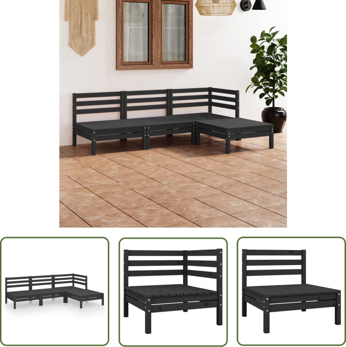 4-delige Loungeset massief grenenhout zwart Deze houten tuinset is een ideale keuze om te ontspannen en te genieten van het weer, een dutje te doen of met vrienden en familie te kletsen. Dankzij het tijdloze palletontwerp voegt de houten meubelset een vleugje rustieke charme toe aan je terras, tuin of woonkamer. Deze tuinmeubelset is gemaakt van geïmpregneerd grenenhout en is duurzaam en weerbestendig. Deze loungeset heeft een stevige constructie en vergt weinig onderhoud. Daarnaast kun je de set in elke gewenste opstelling plaatsen, dankzij het modulaire ontwerp. Opmerking: om de levensduur van je tuinmeubelen te verlengen, raden wij je aan om de meubelen met een waterbestendige hoes af te dekken Jouw voordelen Deze trendy en comfortabele houten loungeset is een echte blikvanger in je tuin of op je terras! Overige specificaties Kleur: zwart Materiaal: massief grenenhout Afmetingen hoek-/middenbank: 63,5 x 63,5 x 62,5 cm (L x B x H) Afmetingen voetenbank/tafel: 63,5 x 63,5 x 28,5 cm (L x B x H) Montage vereist Verpakkingsinhoud 1 x hoekbank 2 x middenbank 1 x voetenbank/tafel Goed om te weten Uw bestelling wordt in 2 pakketten geleverd. U krijgt direct uw bezorginformatie van ons wanner uw bestelling succesvol is ingepakt. In sommige gevallen kan het voorkomen dat uw bestelling niet in één keer bij u aankomt. In dat geval wordt veelal de overige pakketten één dag later geleverd. Dit kunt u vinden de mail omtrent uw bezorginformatie. Wij wensen u veel plezier met uw aankoop. Onze belofte Wij vinden het erg belangrijk dat u zorgeloos en zonder moeite online moet kunnen winkelen. Daarbij hoort een fijne service! Wij willen deze service graag aanbieden aan u als klant. Bij ons kunt u er altijd van op aan dat uw bestelling gratis bij u geleverd wordt. Geen verborgen of extra kosten dus! Bent u toch niet helemaal tevreden met uw bestelling dan zorgen wij ervoor dat u uw bestelling ook altijd kunt retourneren aan ons! Heeft u nog overige vragen over uw product of over uw bestelling, dan staan onze specialisten voor u klaar!