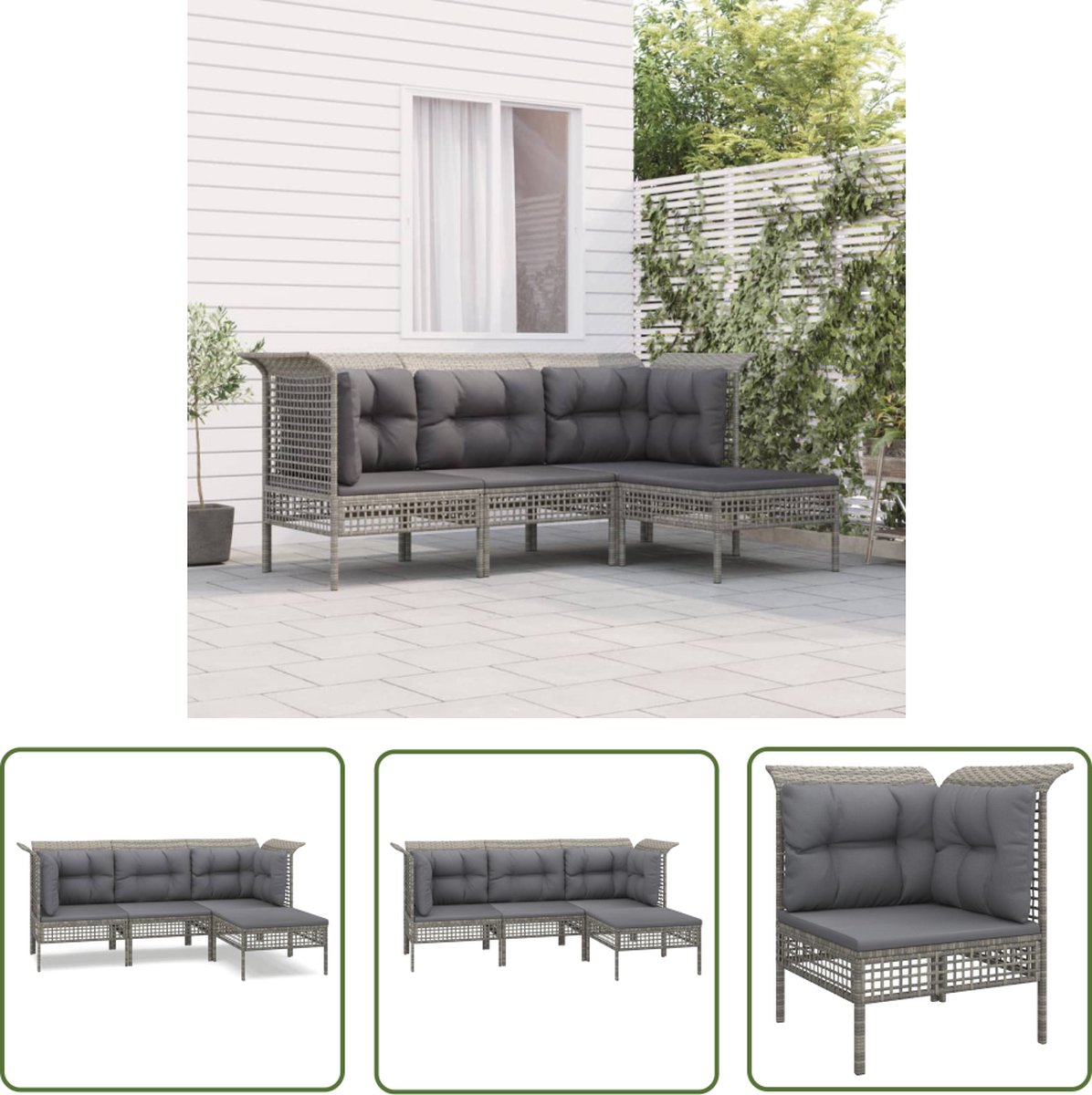 4-delige Loungeset met kussens poly rattan grijs Geniet comfortabel van je buitenruimte met deze loungeset! Deze loungeset is een perfecte aanvulling op je tuin of terras en creëert een blijvende indruk! Weerbestendig materiaal: PE-rattan, ook wel bekend als poly rattan, is weerbestendig en eenvoudig schoon te maken. Hij blijft gedurende een lange periode zeer mooi. Hij biedt geweldige kwaliteit, gemak en een esthetische uitstraling. Stevig frame: het gepoedercoat stalen frame zorgt ervoor dat de tuinset stevig en stabiel is voor dagelijks gebruik buitenshuis. Comfortabele zitervaring: de rugleuning geeft de loungeset extra zitcomfort. De dik gevoerde kussens zorgen voor extra comfort tijdens het zitten. Modulair ontwerp: elk item is flexibel en gemakkelijk te verplaatsen, zodat je het met andere modulaire segmenten uit onze webshop kunt combineren om je eigen persoonlijke opstellingen te creëren! Opmerking: Om de levensduur van je tuinmeubelen te verlengen, raden wij je aan om de meubelen met een waterbestendige hoes af te dekken. Jouw voordelen Geniet comfortabel van je buitenruimte met deze loungeset! Deze loungeset is een perfecte aanvulling op je tuin of terras en creëert een blijvende indruk! Overige specificaties Tuinhoekbank: Kleur: grijs Materiaal: PE-rattan en gepoedercoat staal Afmetingen: 65 x 65 x 75 cm (B x D x H) Breedte zitting: 55 m Diepte zitting: 55 cm Zithoogte vanaf de grond: 32 cm Draagvermogen: 110 kg Met rasterontwerp Tuinmiddenbank: Kleur: grijs Materiaal: PE-rattan en gepoedercoat staal Afmetingen: 55 x 65 x 75 cm (B x D x H) Breedte zitting: 55 m Diepte zitting: 55 cm Zithoogte vanaf de grond: 32 cm Draagvermogen: 110 kg Met rasterontwerp Tuinvoetenbank: Kleur: grijs Materiaal: PE-rattan en gepoedercoat staal Afmetingen: 55 x 55 x 32 cm (B x D x H) Draagvermogen: 110 kg Met rasterontwerp Kussen: Kleur: donkergrijs Materiaal: stof (100% polyester) Materiaal vulling zitkussen: schuim Vulling rugkussen: katoenvezel Afmetingen zitkussen: 55 x 55 x 3 cm (L x B x D) Afmetingen rugkussen (groot): 56 x 39 x 10 cm (L x B x D) Afmetingen rugkussen (klein): 48 x 39 x 10 cm (L x B x D) Montage vereist: ja Verpakkingsinhoud 2 x tuinhoekbank 1 x tuinmiddenbank 1 x tuinvoetenbank 4 x zitkussen 3 x rugkussen (groot) 2 x rugkussen (klein) Goed om te weten Uw bestelling wordt in 2 pakketten geleverd. U krijgt direct uw bezorginformatie van ons wanner uw bestelling succesvol is ingepakt. In sommige gevallen kan het voorkomen dat uw bestelling niet in één keer bij u aankomt. In dat geval wordt veelal de overige pakketten één dag later geleverd. Dit kunt u vinden de mail omtrent uw bezorginformatie. Wij wensen u veel plezier met uw aankoop. Onze belofte Wij vinden het erg belangrijk dat u zorgeloos en zonder moeite online moet kunnen winkelen. Daarbij hoort een fijne service! Wij willen deze service graag aanbieden aan u als klant. Bij ons kunt u er altijd van op aan dat uw bestelling gratis bij u geleverd wordt. Geen verborgen of extra kosten dus! Bent u toch niet helemaal tevreden met uw bestelling dan zorgen wij ervoor dat u uw bestelling ook altijd kunt retourneren aan ons! Heeft u nog overige vragen over uw product of over uw bestelling, dan staan onze specialisten voor u klaar!