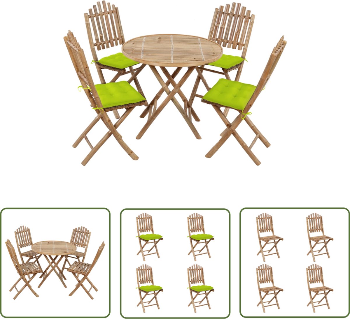 5-delige Tuinset inklapbaar met kussens bamboe Deze bamboe eethoek met kussens heeft een elegant design en voegt een vleugje rustieke charme toe aan je etentjes buiten. De tuinset is gemaakt van massief bamboe waardoor hij sterk en duurzaam is. Hij is ook weerbestendig, waterdicht en gemakkelijk schoon te maken met een vochtige doek. De tafel en stoelen zijn inklapbaar om ruimte te besparen wanneer ze niet in gebruik zijn. De meegeleverde kussens bieden extra comfort tijdens het loungen. Elk kussen is gemaakt van 100% polyester dat behandeld is om het waterafstotend te maken. Elk kussen heeft twee sets touwtjes voor stevige bevestiging aan de eetstoel. Opmerking: om de levensduur van je tuinmeubelen te verlengen, raden wij je aan om de meubelen met een waterbestendige hoes af te dekken Jouw voordelen Deze inklapbare bamboe tuinset met kussens is perfect om heerlijk buiten te eten of te loungen. Overige specificaties Kleur kussen: heldergroen Materiaal tafel en stoel: bamboe Materiaal kussen: stof (100% polyester) Afmetingen tafel: 80 x 70 cm (ø x H) Afmetingen stoel: 50 x 42 x 92 cm (B x D x H) Afmetingen kussen: 40 x 40 x 7 cm (L x B x H) Inklapbaar ontwerp Water- en weerbestendig Elk kussen heeft 2 sets touwtjes Montage vereist Verpakkingsinhoud 1 x tafel 4 x stoel met kussen Goed om te weten Uw bestelling wordt in 3 pakketten geleverd. U krijgt direct uw bezorginformatie van ons wanner uw bestelling succesvol is ingepakt. In sommige gevallen kan het voorkomen dat uw bestelling niet in één keer bij u aankomt. In dat geval wordt veelal de overige pakketten één dag later geleverd. Dit kunt u vinden de mail omtrent uw bezorginformatie. Wij wensen u veel plezier met uw aankoop. Onze belofte Wij vinden het erg belangrijk dat u zorgeloos en zonder moeite online moet kunnen winkelen. Daarbij hoort een fijne service! Wij willen deze service graag aanbieden aan u als klant. Bij ons kunt u er altijd van op aan dat uw bestelling gratis bij u geleverd wordt. Geen verborgen of extra kosten dus! Bent u toch niet helemaal tevreden met uw bestelling dan zorgen wij ervoor dat u uw bestelling ook altijd kunt retourneren aan ons! Heeft u nog overige vragen over uw product of over uw bestelling, dan staan onze specialisten voor u klaar!