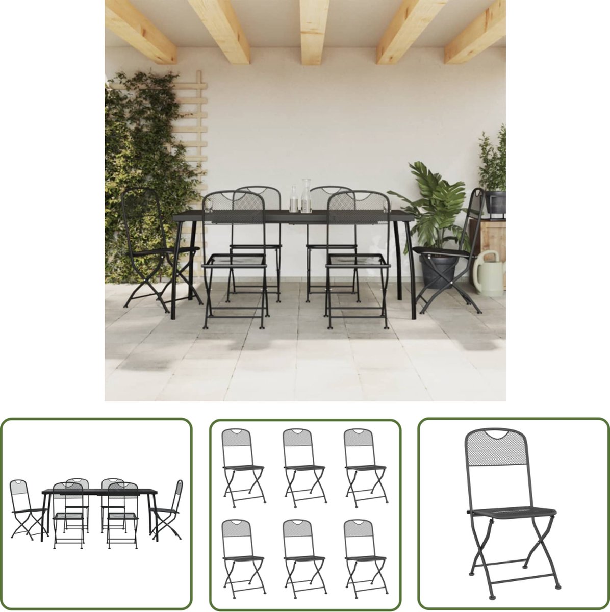 Creëer een stijlvolle buitenruimte met de The Living Store 7-delige Tuinset in antracietkleurig metaalgaas. Deze set biedt comfort en elegantie voor je tuin of terras.