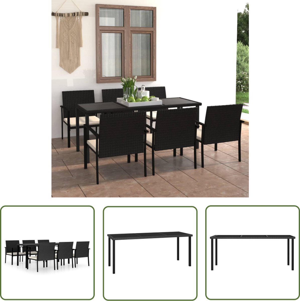 7-delige Tuinset poly rattan zwart Deze prachtig ontworpen tuinset is een blikvanger in je tuin of op je terras!Het stalen frame maakt de tafel en de stoelen stevig en stabiel. De set is ook lichtgewicht zodat alle onderdelen makkelijk te verplaatsen en geschikt voor buitengebruik zijn. Dankzij het weer- en waterbestendige PE-rattan is deze buitenmeubelset makkelijk schoon te maken en duurzaam. De dik gevoerde, afneembare zitkussens bieden extra zitcomfort.Opmerking: wij raden aan om de set af te dekken wanneer het regent, sneeuwt of vriest. Jouw voordelen Deze poly rattan tuinmeubelset is een perfecte keuze voor een heerlijk diner buiten of om gewoon buiten te ontspannen. Overige specificaties Tafel: Kleur: zwart Materiaal: poly rattan, gepoedercoat staal en glas Afmetingen tafel: 180 x 70 x 73 cm (L x B x H) Stoel: Kleur: zwart Kleur kussen: crème Materiaal: poly rattan en gepoedercoat staal Materiaal kussen: stof (100% polyester) Afmetingen stoel: 53 x 58,5 x 83 cm (B x D x H) Afmetingen zitting: 47/41 x 45 cm (B x D) Zithoogte vanaf de grond: 42 cm Hoogte armleuning vanaf de grond: 61 cm Dikte zitkussen: 5 cm Verpakkingsinhoud 1 x tafel 6 x stoel 6 x zitkussen Goed om te weten Uw bestelling wordt in 3 pakketten geleverd. U krijgt direct uw bezorginformatie van ons wanner uw bestelling succesvol is ingepakt. In sommige gevallen kan het voorkomen dat uw bestelling niet in één keer bij u aankomt. In dat geval wordt veelal de overige pakketten één dag later geleverd. Dit kunt u vinden de mail omtrent uw bezorginformatie. Wij wensen u veel plezier met uw aankoop. Onze belofte Wij vinden het erg belangrijk dat u zorgeloos en zonder moeite online moet kunnen winkelen. Daarbij hoort een fijne service! Wij willen deze service graag aanbieden aan u als klant. Bij ons kunt u er altijd van op aan dat uw bestelling gratis bij u geleverd wordt. Geen verborgen of extra kosten dus! Bent u toch niet helemaal tevreden met uw bestelling dan zorgen wij ervoor dat u uw bestelling ook altijd kunt retourneren aan ons! Heeft u nog overige vragen over uw product of over uw bestelling, dan staan onze specialisten voor u klaar!