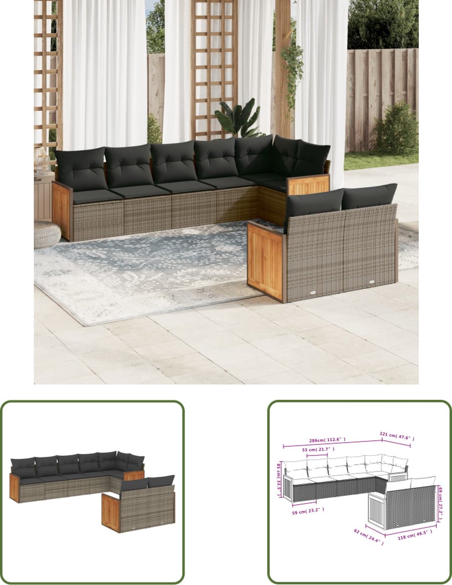 8-delige Loungeset met kussens poly rattan grijs Deze loungeset is de perfecte aanvulling op je tuin of terras en biedt een comfortabele en uitnodigende ruimte om met familie en vrienden te kletsen of gewoon buiten te ontspannen en te genieten. Duurzaam materiaal: PE-rattan, ook wel poly rattan genoemd, is een sterke, onderhoudsarme kunststof die lijkt op natuurlijk rattan. Het is licht van gewicht en gemakkelijk schoon te maken en wordt vaak gebruikt voor tuinmeubelen vanwege de duurzaamheid en weerbestendige eigenschappen. Opbergfunctie met waterdichte tas: het tuinmeubel heeft opbergruimte onder de zitting, compleet met een waterdichte zak voor het opbergen van kussens, speelgoed en andere spullen. De binnenzak kan veilig aan het tuinmeubilair worden bevestigd met klittenbandsluitingen voor extra stabiliteit. Afneembare en wasbare hoes: deze zitkussens hebben afneembare hoezen, waardoor ze eenvoudig te wassen en te onderhouden zijn. Modulair ontwerp: deze tuinmeubelset heeft een modulair ontwerp, waardoor hij volledig flexibel en gemakkelijk te verplaatsen is. Op die manier kun je een opstelling van tuinmeubilair creëren. Goed om te weten: Om de levensduur van je tuinmeubelen te verlengen, raden wij je aan om de meubelen met een waterbestendige hoes af te dekken. Jouw voordelen Deze loungeset is de perfecte aanvulling op je tuin of terras en biedt een comfortabele en uitnodigende ruimte om met familie en vrienden te kletsen of gewoon buiten te ontspannen en te genieten. Overige specificaties Draagvermogen (per zitplek): 110 kg Uv-bestendig Verstelbare kunstof voetjes Montage vereist: ja Hoekzitting: Kleur: grijs Materiaal: PE-rattan en gepoedercoat staal Afmetingen: 62 x 62 x 69 cm (B x D x H) Afmetingen zitting: 55 x 55 cm (B x D) Zithoogte vanaf de grond: 37 cm Middelste stoel: Kleur: grijs Materiaal: PE-rattan en gepoedercoat staal Afmetingen: 55 x 62 x 69 cm (B x D x H) Afmetingen zitting: 55 x 55 cm (B x D) Zithoogte vanaf de grond: 37 cm Bank met armleuning: Kleur: grijs Materiaal: PE-rattan, gepoedercoat staal en massief acaciahout met olieafwerking Afmetingen: 59 x 62 x 69 cm (B x D x H) Afmetingen zitting: 55 x 55 cm (B x D) Zithoogte vanaf de grond: 37 cm Hoogte armleuning vanaf de grond: 55 cm Kussen: Kleur: donkergrijs Materiaal hoes: stof (100% polyester) Materiaal vulling zitkussen: schuim Vulling rugkussen: katoenvezel Afmetingen zitkussen: 55 x 55 x 3 cm (B x D x D) Afmetingen rugkussen: 55 x 45 x 13 cm (L x B x D) Verpakkingsinhoud 1 x hoekstoel inclusief opbergfunctie met waterdichte tas 3 x middenstoel inclusief opbergfunctie met een waterdichte tas 4 x bank met armleuning inclusief opbergfunctie met waterdichte zak 9 x rugkussen 8 x zitkussen voor hoge rugleuning, met afneembare en wasbare hoes Goed om te weten Uw bestelling wordt in 4 pakketten geleverd. U krijgt direct uw bezorginformatie van ons wanner uw bestelling succesvol is ingepakt. In sommige gevallen kan het voorkomen dat uw bestelling niet in één keer bij u aankomt. In dat geval wordt veelal de overige pakketten één dag later geleverd. Dit kunt u vinden de mail omtrent uw bezorginformatie. Wij wensen u veel plezier met uw aankoop. Onze belofte Wij vinden het erg belangrijk dat u zorgeloos en zonder moeite online moet kunnen winkelen. Daarbij hoort een fijne service! Wij willen deze service graag aanbieden aan u als klant. Bij ons kunt u er altijd van op aan dat uw bestelling gratis bij u geleverd wordt. Geen verborgen of extra kosten dus! Bent u toch niet helemaal tevreden met uw bestelling dan zorgen wij ervoor dat u uw bestelling ook altijd kunt retourneren aan ons! Heeft u nog overige vragen over uw product of over uw bestelling, dan staan onze specialisten voor u klaar!
