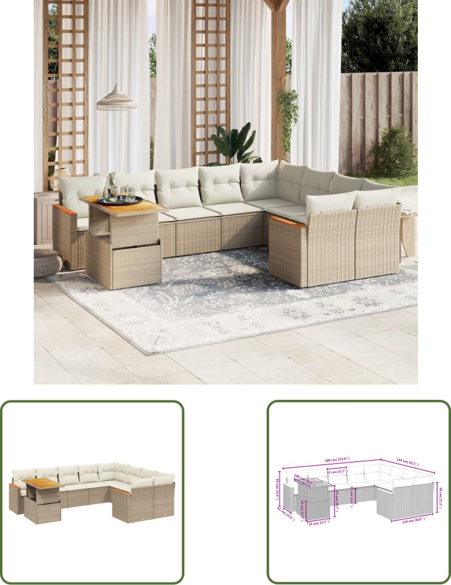8-delige Loungeset met kussens poly rattan zwart Deze loungeset is de perfecte aanvulling op je tuin of terras en biedt een comfortabele en uitnodigende ruimte om met familie en vrienden te kletsen of gewoon buiten te ontspannen en te genieten. Duurzaam materiaal: PE-rattan, ook wel poly rattan genoemd, is een sterke, onderhoudsarme kunststof die lijkt op natuurlijk rattan. Het is licht van gewicht en gemakkelijk schoon te maken en wordt vaak gebruikt voor tuinmeubelen vanwege de duurzaamheid en weerbestendige eigenschappen. Stevig en eenvoudig schoon te maken tafelblad: deze tuintafel heeft een houten blad dat stevig, duurzaam en eenvoudig schoon te maken is met een vochtige doek. Opbergfunctie met waterdichte tas: elke tuinstoel heeft opbergruimte onder de zitting, compleet met een waterdichte tas voor het opbergen van kussens, speelgoed en andere spullen. De binnentassen hebben een bovenklep en kunnen met klittenband stevig aan de stoelen worden bevestigd voor extra stabiliteit. Comfortabele zitervaring: deze buitenmeubelen, compleet met dik gevoerde kussens, bieden een comfortabele zitervaring. Modulair ontwerp: deze tuinmeubelset heeft een modulair ontwerp, waardoor hij volledig flexibel en gemakkelijk te verplaatsen is. Op die manier kun je een opstelling van tuinmeubilair creëren. Goed om te weten: Om de levensduur van je tuinmeubelen te verlengen, raden wij je aan om de meubelen met een waterbestendige hoes af te dekken. Jouw voordelen Deze loungeset is de perfecte aanvulling op je tuin of terras en biedt een comfortabele en uitnodigende ruimte om met familie en vrienden te kletsen of gewoon buiten te ontspannen en te genieten. Overige specificaties Draagvermogen (per zitplek): 110 kg Uv-bestendig Montage vereist: ja Hoekzitting: Kleur: zwart Materiaal: PE-rattan en gepoedercoat staal Afmetingen: 62 x 62 x 69 cm (B x D x H) Afmetingen zitting: 55 x 55 cm (B x D) Zithoogte vanaf de grond: 37 cm Middelste stoel: Kleur: zwart Materiaal: PE-rattan en gepoedercoat staal Afmetingen: 55 x 62 x 69 cm (B x D x H) Afmetingen zitting: 55 x 55 cm (B x D) Zithoogte vanaf de grond: 37 cm Bank met armleuning: Kleur: zwart Materiaal: PE-rattan en gepoedercoat staal Afmetingen: 70 x 62 x 69 cm (B x D x H) Afmetingen zitting: 55 x 55 cm (B x D) Zithoogte vanaf de grond: 37 cm Hoogte armleuning vanaf de grond: 55 cm Tafel: Kleur: zwart Materiaal: PE-rattan, gepoedercoat staal en massief acaciahout met olieafwerking Afmetingen: 55 x 55 x 37 cm (L x B x H) Kussen: Kleur: zwart Materiaal hoes: stof (100% polyester) Materiaal vulling zitkussen: schuim Vulling rugkussen: katoenvezel Afmetingen zitkussen: 55 x 55 x 3 cm (B x D x D) Afmetingen rugkussen: 55 x 45 x 13 cm (L x B x D) Verpakkingsinhoud 2 x hoekstoel inclusief opbergfunctie met waterdichte tas 3 x middenstoel inclusief opbergfunctie met een waterdichte tas 2 x bank met armleuning inclusief opbergfunctie met waterdichte zak 1 x tuintafel 9 x rugkussen 7 x zitkussen Goed om te weten Uw bestelling wordt in 4 pakketten geleverd. U krijgt direct uw bezorginformatie van ons wanner uw bestelling succesvol is ingepakt. In sommige gevallen kan het voorkomen dat uw bestelling niet in één keer bij u aankomt. In dat geval wordt veelal de overige pakketten één dag later geleverd. Dit kunt u vinden de mail omtrent uw bezorginformatie. Wij wensen u veel plezier met uw aankoop. Onze belofte Wij vinden het erg belangrijk dat u zorgeloos en zonder moeite online moet kunnen winkelen. Daarbij hoort een fijne service! Wij willen deze service graag aanbieden aan u als klant. Bij ons kunt u er altijd van op aan dat uw bestelling gratis bij u geleverd wordt. Geen verborgen of extra kosten dus! Bent u toch niet helemaal tevreden met uw bestelling dan zorgen wij ervoor dat u uw bestelling ook altijd kunt retourneren aan ons! Heeft u nog overige vragen over uw product of over uw bestelling, dan staan onze specialisten voor u klaar!