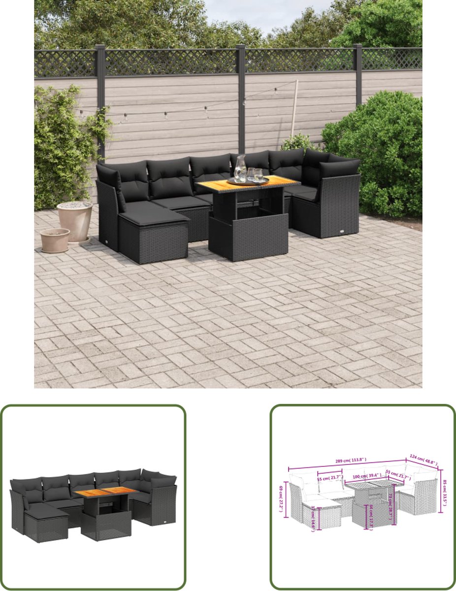 The Living Store 8-delige Loungeset met kussens poly rattan zwart – Loungeset – Tuinset – Lounge – Buitendecoratie – Garden Furniture