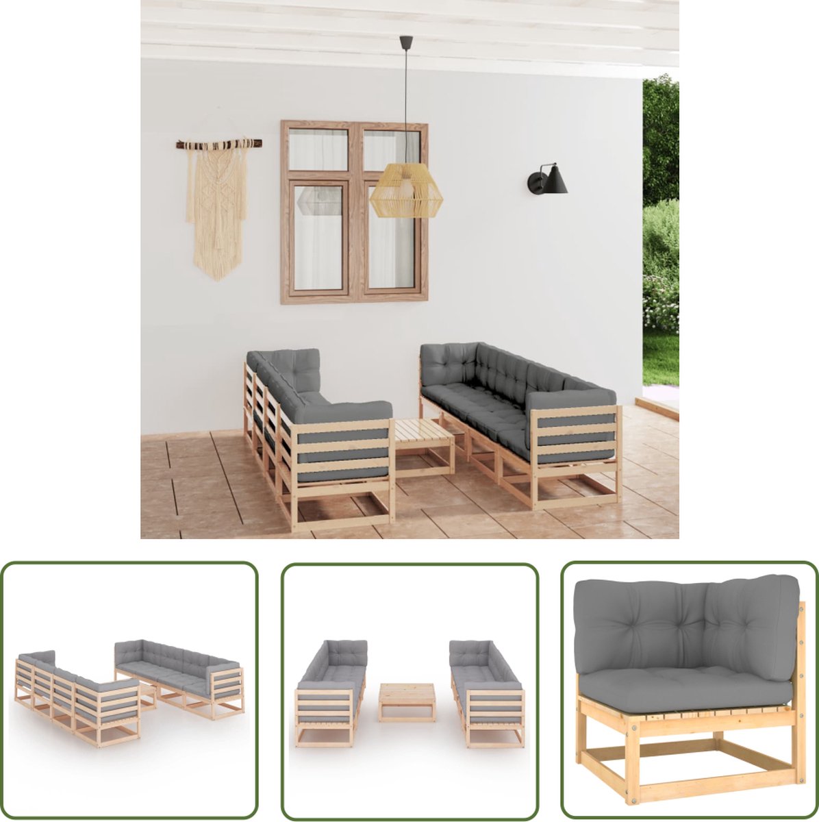 The Living Store 9-delige Loungeset met kussens massief grenenhout – Loungeset – Tuinlounge – Buitentijnen – Loungehoek – Houten Bank