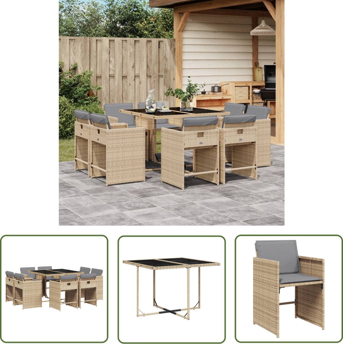 9-delige Tuinset met kussens poly rattan gemengd beige Deze tuinset is een goede keuze als je ervan houdt om gezellig buiten te eten of gewoon in de tuin, of op het terras wil ontspannen. Duurzaam materiaal: PE-rattan, ook wel poly rattan genoemd, is een sterke, onderhoudsarme kunststof die lijkt op natuurlijk rattan. Het is licht van gewicht en gemakkelijk schoon te maken en wordt vaak gebruikt voor tuinmeubelen vanwege de duurzaamheid en weerbestendige eigenschappen. Compact opbergen: deze stoelen hebben een inklapbare rugleuning, waardoor je ze gemakkelijk onder de tafel kunt opbergen. Wanneer ze zijn ingeklapt, passen ze netjes onder de tafel en vormen ze een ruimtebesparende kubusvorm. Comfortabele zitervaring: deze buitenmeubelen, compleet met dik gevoerde kussens, bieden een comfortabele zitervaring. Afneembare en wasbare hoes: deze zitkussens hebben afneembare hoezen, waardoor ze eenvoudig te wassen en te onderhouden zijn. De stoelkussenhoezen hebben aan de achterkant een flap, waardoor ze eenvoudig aan de stoelen te bevestigen zijn. Stevig en eenvoudig schoon te maken tafelblad: deze tuintafel heeft een blad van gehard glas dat stevig en duurzaam is en eenvoudig schoon te maken is met een vochtige doek. Goed om te weten: Om de levensduur van je tuinmeubelen te verlengen, raden wij je aan om de meubelen met een waterbestendige hoes af te dekken. Jouw voordelen Deze tuinset is een goede keuze als je ervan houdt om gezellig buiten te eten of gewoon in de tuin, of op het terras wil ontspannen. Overige specificaties Draagvermogen (per zitplek): 110 kg Uv-bestendig Montage vereist: ja Tafel: Kleur tafel: gemengd beige Kleur glas: zwart Materiaal: PE-rattan, gepoedercoat staal en gehard glas Afmetingen: 110 x 106 x 73 cm (L x B x H) Stoel: Kleur: gemengd beige Materiaal: PE-rattan en gepoedercoat staal Afmetingen: 50,5 x 50 x 79 cm (B x D x H) Afmetingen zitting: 45,5 x 38 cm (B x D) Zithoogte vanaf de grond: 43 cm Hoogte armleuning vanaf de grond: 63,5 cm Kussen: Kleur: lichtgrijs Materiaal hoes: stof (100% polyester) Materiaal vulling: schuim Afmetingen stoelkussen: 76 x 46 x 2 cm (L x B x D) Verpakkingsinhoud 1 x tuintafel 8 x tuinstoel 8 x stoelkussen voor hoge rugleuning, met afneembare en wasbare hoes Goed om te weten Uw bestelling wordt in 3 pakketten geleverd. U krijgt direct uw bezorginformatie van ons wanner uw bestelling succesvol is ingepakt. In sommige gevallen kan het voorkomen dat uw bestelling niet in één keer bij u aankomt. In dat geval wordt veelal de overige pakketten één dag later geleverd. Dit kunt u vinden de mail omtrent uw bezorginformatie. Wij wensen u veel plezier met uw aankoop. Onze belofte Wij vinden het erg belangrijk dat u zorgeloos en zonder moeite online moet kunnen winkelen. Daarbij hoort een fijne service! Wij willen deze service graag aanbieden aan u als klant. Bij ons kunt u er altijd van op aan dat uw bestelling gratis bij u geleverd wordt. Geen verborgen of extra kosten dus! Bent u toch niet helemaal tevreden met uw bestelling dan zorgen wij ervoor dat u uw bestelling ook altijd kunt retourneren aan ons! Heeft u nog overige vragen over uw product of over uw bestelling, dan staan onze specialisten voor u klaar!