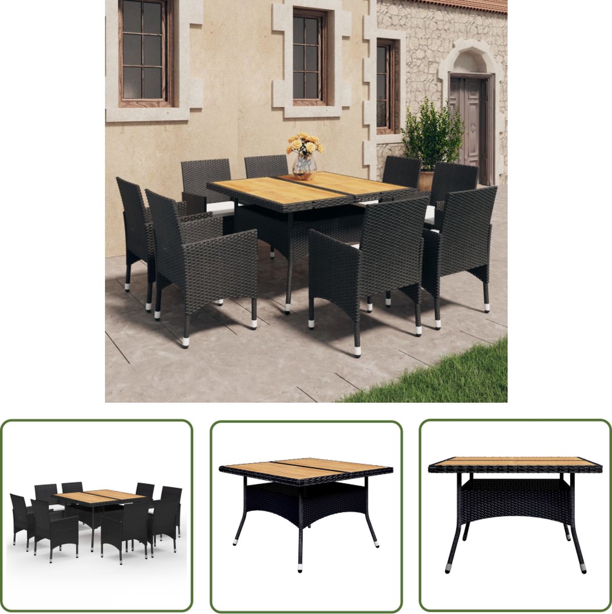9-delige Tuinset poly rattan en acaciahout zwart Geniet van familiebijeenkomsten met onze 9-delige eethoek! Deze eethoek biedt voldoende plek aan je gasten terwijl hij een perfecte eetsfeer creëert! Deze eetset is gemaakt van een versterkt stalen frame dat bedekt is met stijlvol, weerbestendig, handgeweven PE-rattan die voor sterke ondersteuning zorgt en het hele jaar door kan worden gebruikt. Het tafelblad is gemaakt van hoogwaardig massief acaciahout, een tropisch hardhout dat weerbestendig en duurzaam is. Het vakmanschap en de mooie houtnerven maken elk meubel net iets anders dan de rest. Elke stoel wordt geleverd met een afneembaar, dik gevoerd kussen voor extra comfort en ondersteuning tijdens het loungen. Alle kussens zijn afneembaar en hebben een rits. Bovendien maakt de lichtgewicht constructie elk stuk gemakkelijk te verplaatsen, herschikken en vervoeren. Let op: het wordt aanbevolen om de set af te dekken wanneer het regent, sneeuwt of vriest. Jouw voordelen Upgrade je terras of andere buitenruimte met deze prachtige 9-delige eetset! Overige specificaties Kleur: zwart Kleur kussen: crème Materiaal: poly rattan, acaciahout met olieafwerking en gepoedercoat staal Afmetingen tafel: 120 x 120 x 75 cm (L x B x H) Afmetingen stoel: 53 x 58 x 84 cm (B x D x H) Zithoogte vanaf de grond: 42 cm Afmetingen zitting: 39/44,5 x 46 cm (B x D) Hoogte armleuning vanaf de grond: 62/65 cm Stoelen met dik gevoerde kussens Montage vereist Verpakkingsinhoud 1 x tafel 8 x armstoel 8 x zitkussen Goed om te weten Uw bestelling wordt in 3 pakketten geleverd. U krijgt direct uw bezorginformatie van ons wanner uw bestelling succesvol is ingepakt. In sommige gevallen kan het voorkomen dat uw bestelling niet in één keer bij u aankomt. In dat geval wordt veelal de overige pakketten één dag later geleverd. Dit kunt u vinden de mail omtrent uw bezorginformatie. Wij wensen u veel plezier met uw aankoop. Onze belofte Wij vinden het erg belangrijk dat u zorgeloos en zonder moeite online moet kunnen winkelen. Daarbij hoort een fijne service! Wij willen deze service graag aanbieden aan u als klant. Bij ons kunt u er altijd van op aan dat uw bestelling gratis bij u geleverd wordt. Geen verborgen of extra kosten dus! Bent u toch niet helemaal tevreden met uw bestelling dan zorgen wij ervoor dat u uw bestelling ook altijd kunt retourneren aan ons! Heeft u nog overige vragen over uw product of over uw bestelling, dan staan onze specialisten voor u klaar!