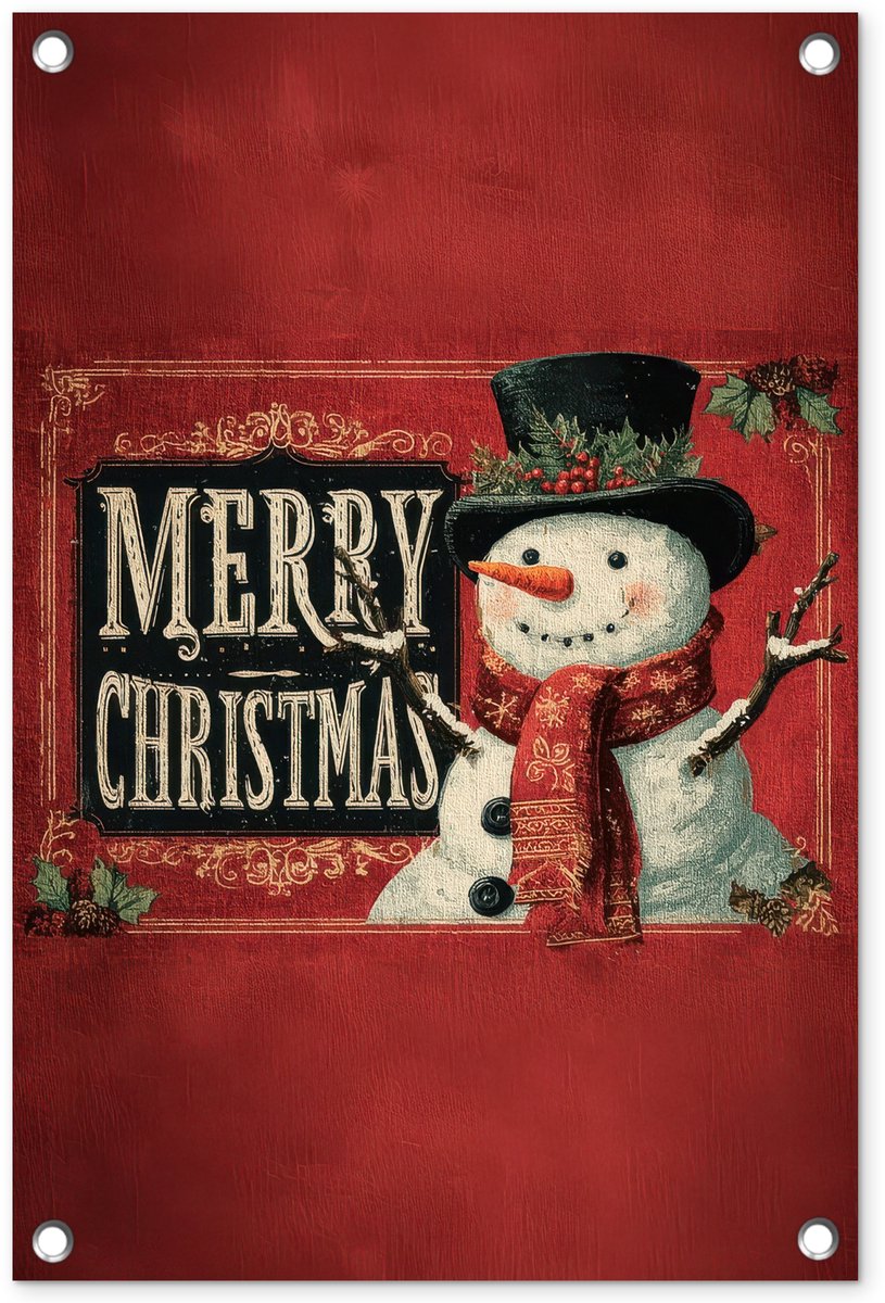 Tuinposter 40×60 cm – Tuindecoratie Klassiek – Kerstgroet – Sneeuwpop – Rood – Poster voor in de tuin – Buiten decoratie – Schutting tuinschilderij – Tuindoek muurdecoratie – Wanddecoratie balkondoek