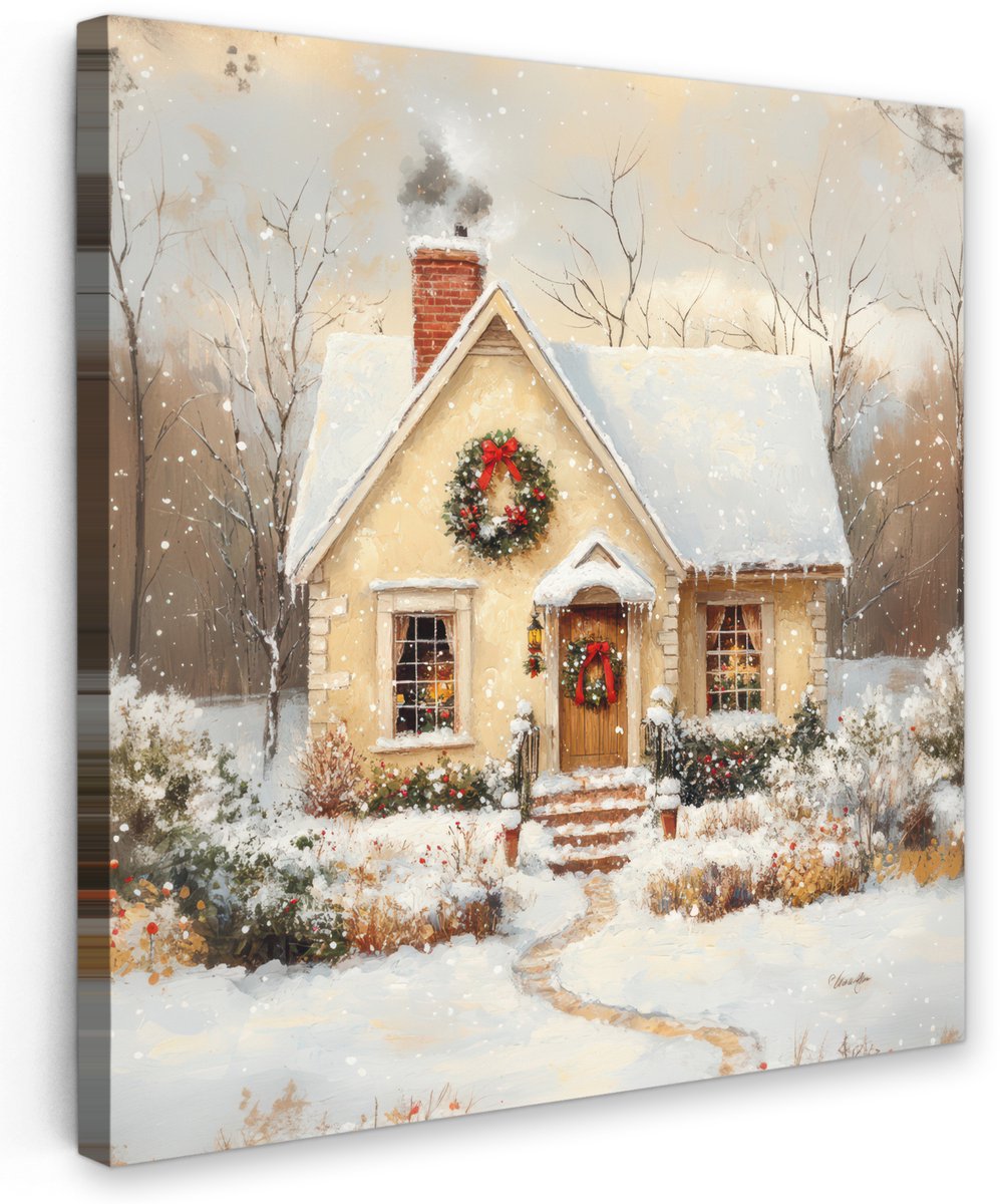 Tuinschilderij voor buiten 70×70 cm – Tuindecoratie Kerst – Huis – Winter – Sneeuw – Tuinposter op canvas – Tuin muurdecoratie – Buitenschilderij decoratie – Schutting wanddecoratie – Buitencanvas