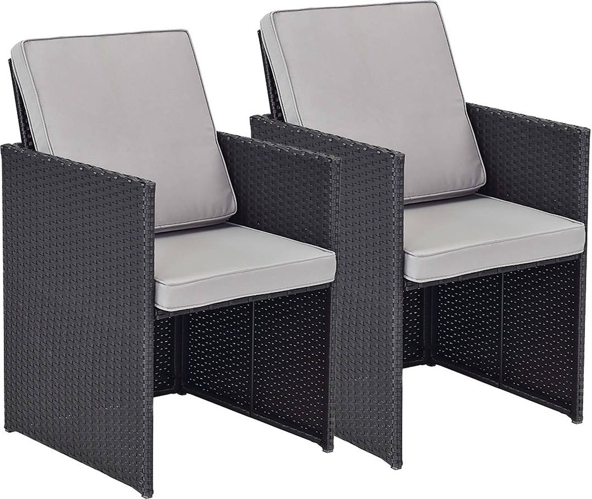Set van 2 Chicago fauteuils Wij bieden u deze prachtige set van 2 Chicago tuinfauteuils aan. De dikke kussens zorgen voor een groot comfort voor de gasten, ze zijn afneembaar en vervolgens gemakkelijk te onderhouden. _x00 0D_ Geniet van fijne tijden met familie en/of vrienden! : Set van 2 Chicago fauteuils – Atlanta – Afmetingen: 56 x 52 x 87 cm – Kunststof, Staal – Zwart. Structuur : Zwart. Kussen : Lichtgrijs. Structuur : Staal – Hars: polyethyleen. Kussen : Stof: polyester – Dichtheid: 200 g/m² – Vulling: polypropyleen – Dichtheid: 1500 g/m². Fauteuil : 56 x 52 x 87 cm. het +-product : Modern – Sober en elegant ontwerp – Glazen blad – Inbouwfauteuils – Kussens met afneembare hoezen – Anti-UV-, antiroest- en waterafstotende behandeling – Eenvoudig en gemakkelijk te onderhouden. Onderhoudstips : Zeepwater + zachte doek – Beschermen met een beschermhoes of indien nodig op een droge plaats plaatsen. Verpakking : 1 pakket: – 0,7 x 0,6 x 0,42 m, 18 kg.